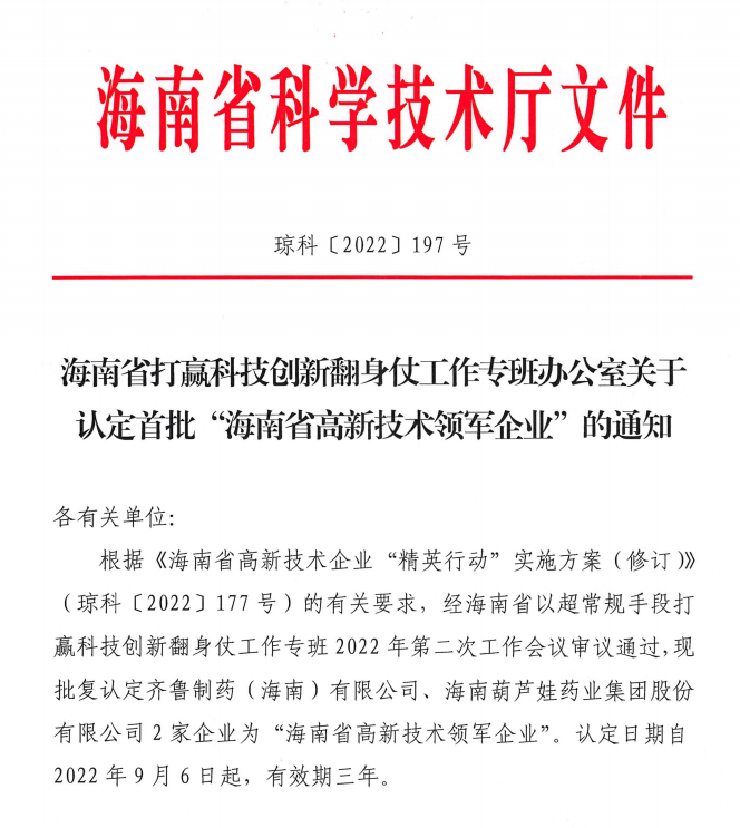 近日,海南省科学技术厅发布的《海南省打赢科技创新翻身仗工作专班办公室关于认定首批“海南省高新技术领军企业”的通知》中显示,批复认定海南尊龙药业集团股份有限公司等2家企业为“海南省高新技术领军企业”。认定日期自2022年9月6日起,有效期三年。