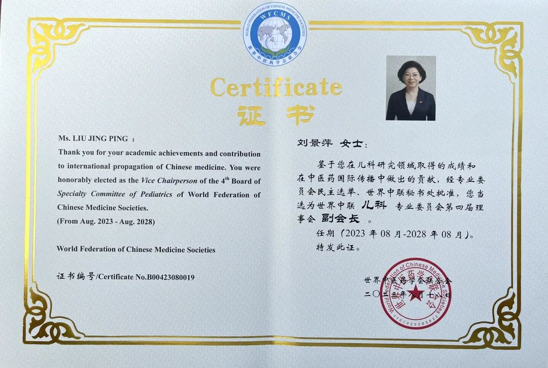 尊龙药业集团党委书记、董事长刘景萍当选世界中医药学会联合会儿科专业委员会第四届理事会副会长